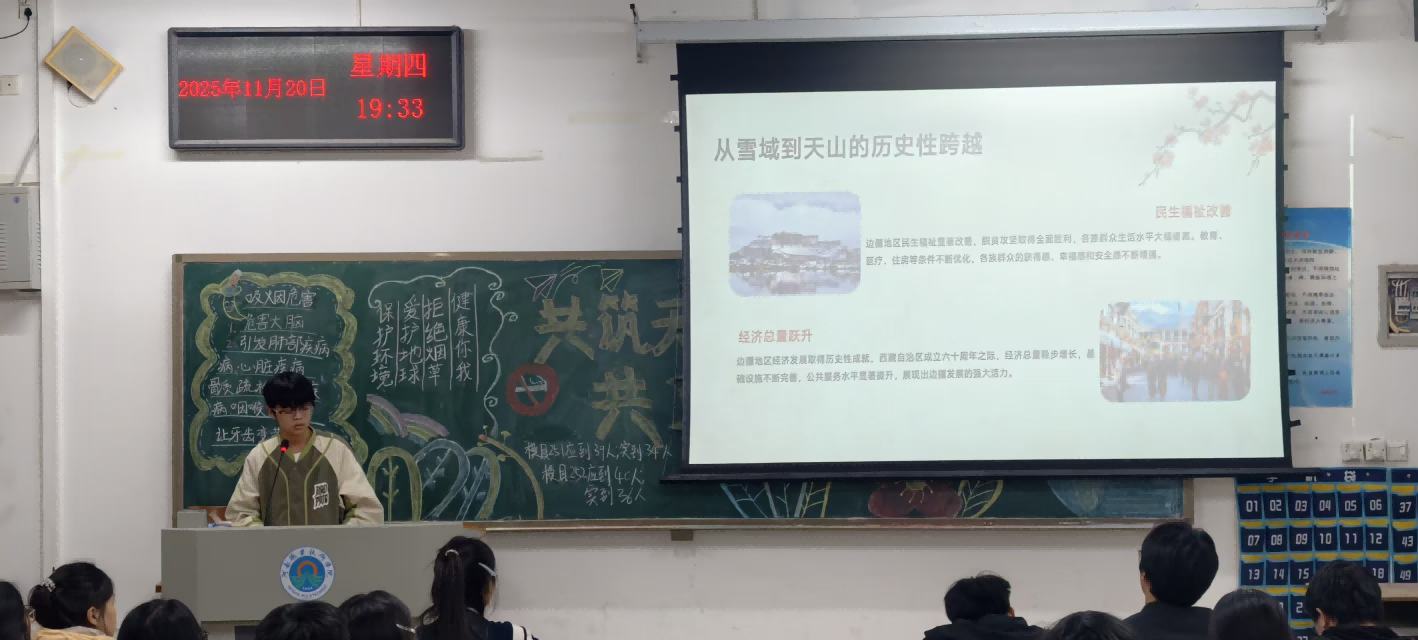 课堂文明与健康校园建设环节,团课以“沉浸式体验+互动研讨”形式展开。通过播放“手机沉迷课堂”“烟草危害健康”主题短片,用真实数据和典型案例敲响警钟;团课聚焦习近平总书记重要回信精神的深刻内涵。授课教师结合回信原文,系统解读“扎根边疆、服务奉献”的时代要求,分享了我校往届毕业生投身西部计划、扎根边疆基层的奋斗故事——他们在支教讲台传递知识,在乡村振兴一线挥洒汗水,在戍边岗位坚守初心,用实际行动诠释了青年的责任与担当。