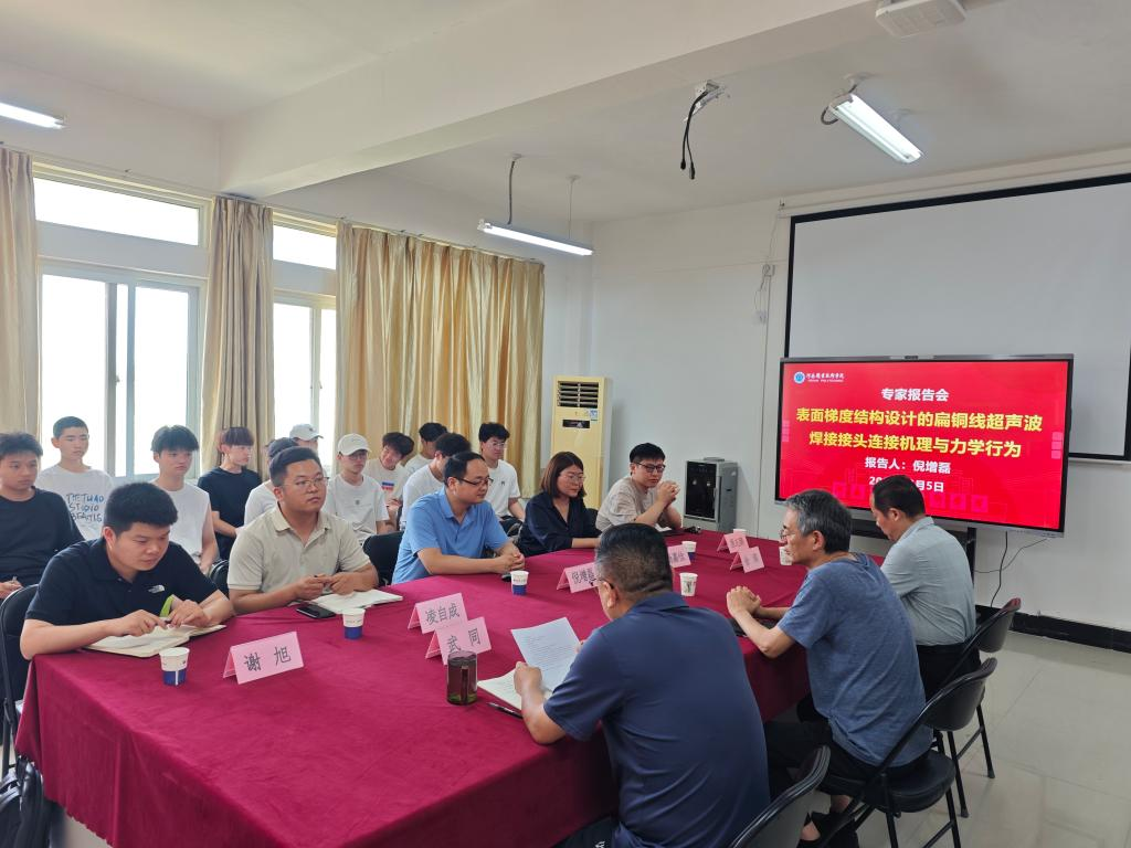 本次活动首先由倪增磊教授作《表面梯度结构设计的扁铜线超声波焊接接头连接机理与力学行为》专题报告,系统阐述其团队在超声波焊接领域的最新研究成果;随后专家团队与学院师生进行了深入的交流,并对我院目前开展的科研项目和“大创赛”“挑战杯”参赛作品进行专业指导;最后倪增磊教授一行实地参观了激光加工中心和焊接实训车间,就设备升级和科教融汇提出建设性意见,同时双方还就联合开展科研项目等事宜达成初步合作意向。