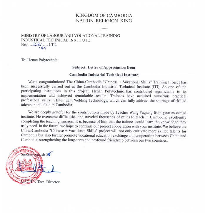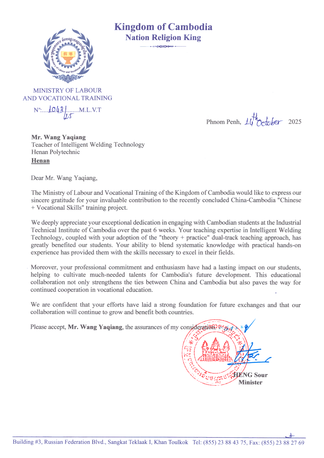 近日,yl6776永利集团官网收到了来自柬埔寨劳工与职业培训部和工业技术学院发来的两封感谢信。信中写道:感谢你们为中国-柬埔寨“中文+职业技能”项目所做的贡献,王亚强老师倾心指导柬埔寨学员的敬业精神令人感佩,您凭借智能焊接技术领域的专业造诣,采用“理论+实践”双轨并行的教学模式,使学员们受益匪浅……